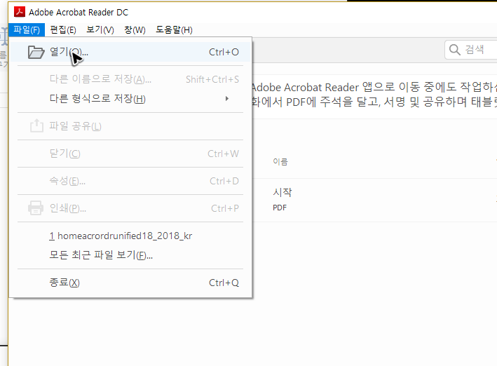 탐색기에서 파일을 선택하고 불러왔다면 프로그램 위쪽에 있는 탐색 기능들을 살펴보고 사용할 기능이 있을 때 활용하시면 됩니다. 보통은 어도비 리더의 다운로드 이유가 문서 실행을 하기 위함이니, 다실 탐색 기능을 쓸 일은 없을 것 같아요.