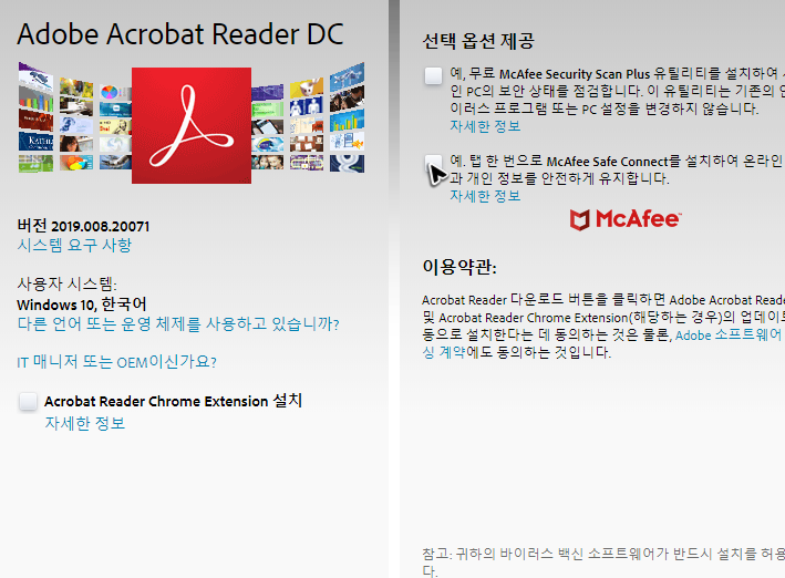 페이지를 방문하면 추가 옵션이 보이는데, 꼭 필요한 부분은 아니기 때문에 그냥 항목에 있는 체크를 모조리 풀어주세요. 그리고 어도비 리더의 다운로드를 위해 아래쪽에서 중간 부분에 있는 버튼을 눌러주세요.
