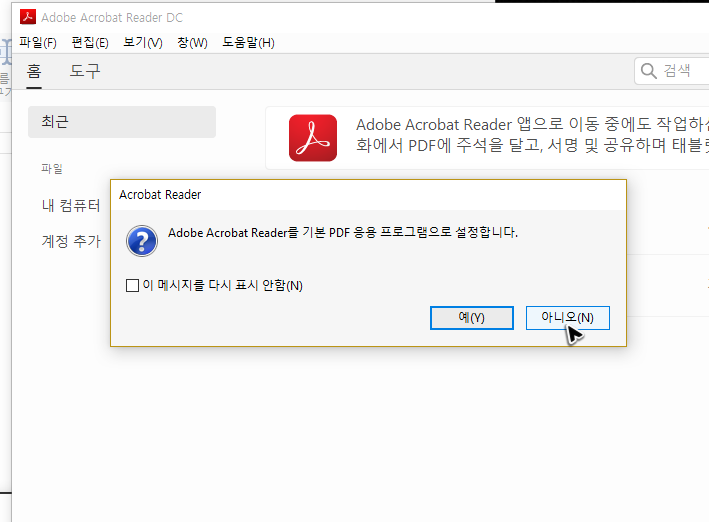 지금까지의 방법으로 어도비 리더의 다운로드와 실행을 완료했다면 하단 이미지와 비슷한 내용의 상자가 하나 실행될 거예요. 이 부분은 그냥 기호에 따라 선택하시면 충분할 것 같아요. 저는 설정이 바뀌는 것을 원하지 않아서 아니오를 지정할게요.