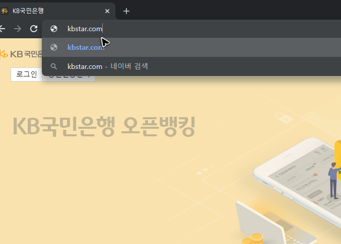 먼저 해주어야 할 작업은 브라우저에 홈페이지를 띄우는 것입니다. 검색해서 띄우거나, 브라우저 주소창에 [kbstar.com]를 복사하고 붙여서 국민은행 개인인터넷뱅킹의 바로가기를 만들 준비를 할 수도 있어요.