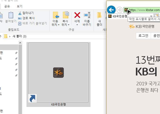 버튼을 보관할 곳을 준비했다면, 이제 브라우저로 돌아와 주세요. 그리고 마우스 커서를 주소창 왼쪽으로 옮기고 드래그 앤드 드롭을 해주세요. 물론 준비해둔 폴더나 배경으로 꺼내면 됩니다. 그럼 국민은행 개인인터넷뱅킹의 바로가기 버튼이 만들어질 거예요. 쉽죠?