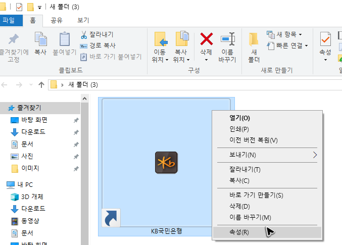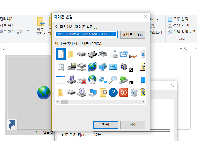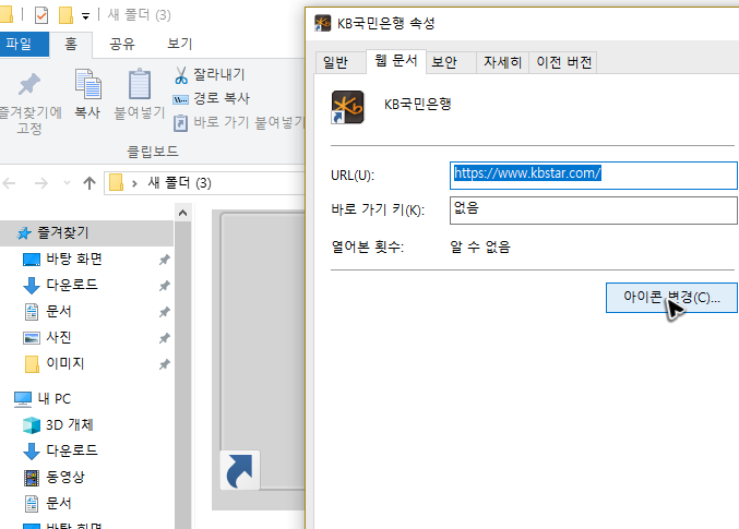 혹시 이렇게 국민은행 개인인터넷뱅킹의 바로가기를 만들기는 했는데, 혹시 모양이 마음에 들지 않는다면, 속성 메뉴로 들어가서 아이콘 변경 작업을 해주면 됩니다.