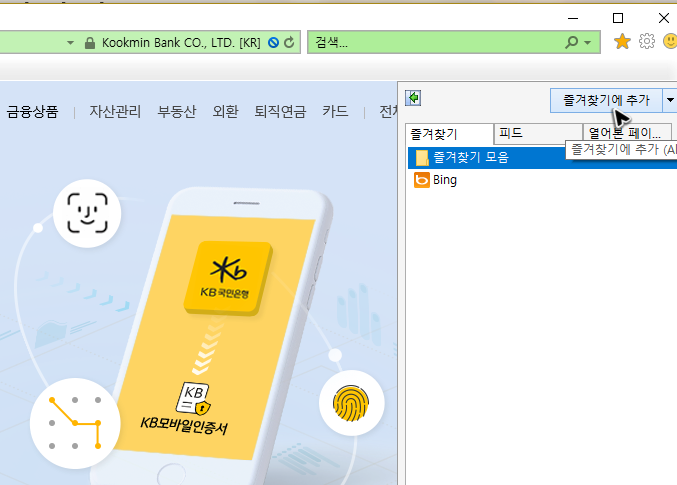 다만, 추가를 해도 버튼이 보이지는 않습니다. 그래서 목록을 불러와야 하는데, 크롬이라면 [Ctrl + Shift + B]를 눌러러서 주소창 아래쪽 영역에 국민은행 개인인터넷뱅킹의 바로가기를 하는 버튼이 나오게 할 수 있습니다.