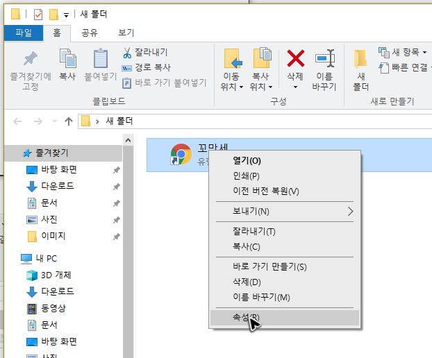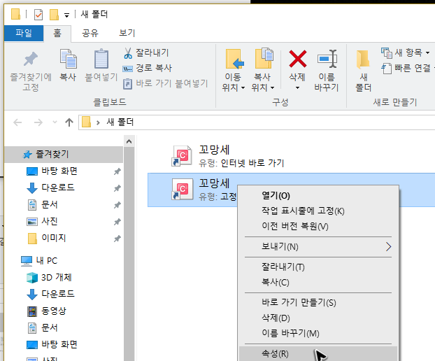 버튼은 기본 모양으로 생성이 될 거예요. 그런에 이 모양이 마음에 들지 않아서 꼬망세의 바로가기를 사용하고 싶지 않다면, 생성해둔 버튼을 우 클릭하고 속성메뉴를 눌러주세요. 그럼 아이콘 변경을 할 수 있습니다.
