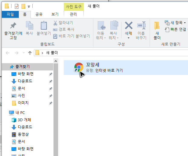 버튼을 보관할 공간을 마련했다면, 다시 브라우저로 시선을 옮기고, 마우스 커서를 주소창 왼쪽에 올려주세요. 그리고 드래그 드롭을 마련서 미리 마련해둔 바탕화면의 공간이나 폴더로 꺼내주면 꼬망세의 바로가기를 하는 버튼이 나옵니다. 쉽죠?