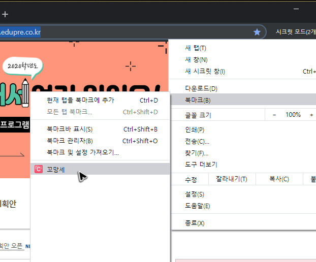 이제 버튼을 실행하면 꼬망세의바로가기를 할 수 있어요. 그런데 혹시 새 브라우저가 띄워지는 부분이 마음에 들지 않는다거나, 번거롭게 느껴지지는 않으신가요? 이럴 땐 북마크를 활용해주세요.