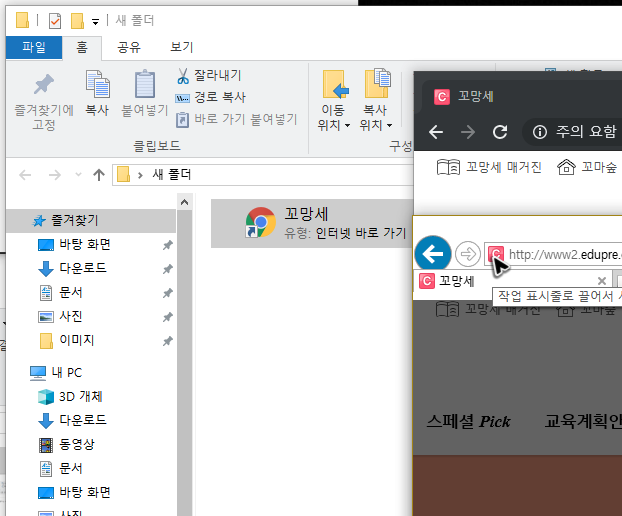 브라우저에 페이지를 띄웠다면, 이번에는 바탕화면이 보이도록 브라우저 크기를 조절해주세요. 혹시 꼬망세의 바로가기를 바탕화면아닌 폴더에 보관할 계획이라면, 폴더를 따로 만들어서 열어두어도 됩니다.