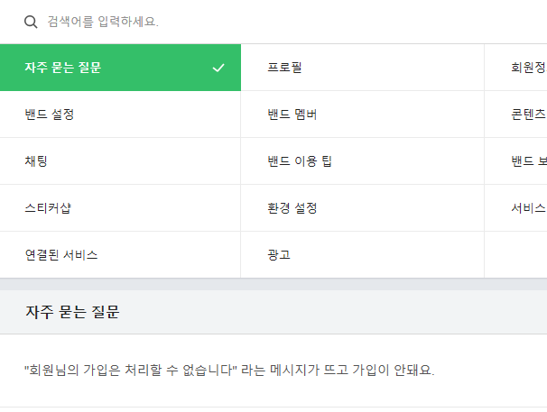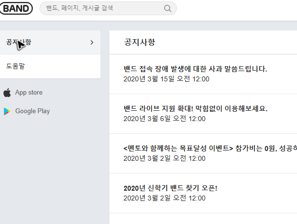 도움말 버튼을 누르면 하단 그림처럼 자주 묻는 질문이 있는 페이지로 이동이 되는데, 우리는 네이버 밴드 pc버전의 다운로드를 해야 하니, 왼쪽 상단에 보이는 공지사항을 눌러야 해요.