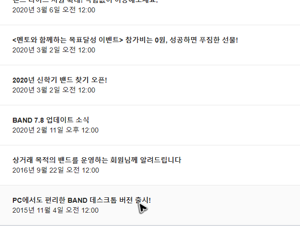 공지사항 버튼을 누른 뒤에는 페이지 중간에 있는 항목들을 확인해주세요. 그럼 가장 아래쪽에서 네이버 밴드 pc버전의 다운로드를 하는 것과 관련된 사항을 확인할 수 있습니다. 물론 클릭하면 됩니다.