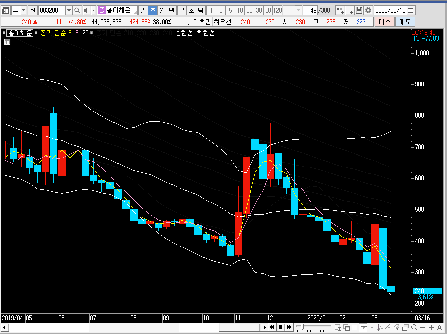 월봉차트를 보면 이번 달은 음봉이 확정이고, 여기에서 길이가 더 길어질 수 있습니다. 주봉에서 흥아해운의 주가를 보면 확장된 밴드 하단선을 건드렸지만, 반등보단 밴드 확장이 될 확률이 더 높게 보여집니다.