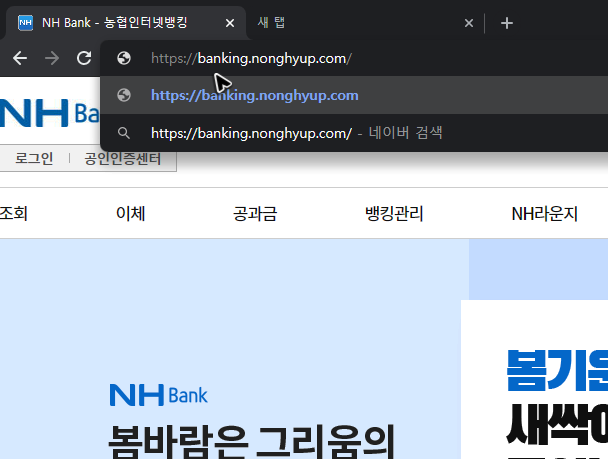 크게 두 가지 방법이 있는데, 어떤 방법이 됐든 제일 먼저 해야 할 일은 브라우저에 사이트를 띄우는 것입니다. 검색해서 찾아갈 수도 있지만, 그냥 [banking.nonghyup.com]를 적어서 농협은행의 개인인터넷뱅킹바로가기를 하는 것이 더 간편해요.