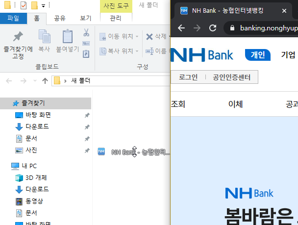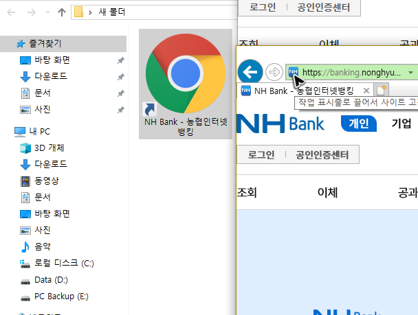 적당하게 창크기를 조절했다면, 이번에는 주소창 왼쪽 부분에 있는 파비콘 영역에 커서를 올려주세요. 그리고 드래그하며 준비해둔 영역으로 꺼내주면 농협은행 개인인터넷뱅킹의 바로가기가 생성됩니다. 간단하죠?