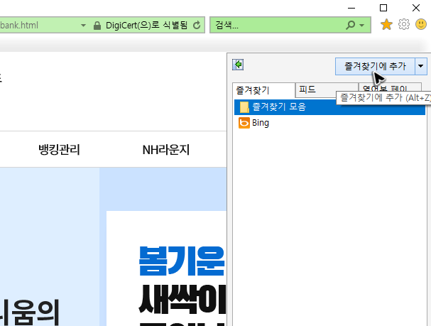 익스플로러도 별표를 누르면 농협은행 개인인터넷뱅킹의 바로가기를 등록할 수 있다는 점은 동일한데, 단축키인 [Alt + Z]를 눌러서 더 빠르게 목록을 구성할 수도 있습니다.