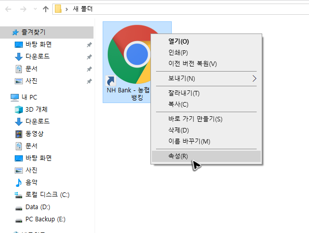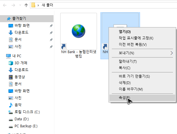 이렇게 농협은행 개인인터넷뱅킹의 바로가기를 만들면 기본 아이콘 모양이 마음에 들지 않을 수 있습니다. 이럴 땐 우 클릭을 해서 속성 메뉴를 눌러주면 아이콘을 변경하는 것도 가능해요. ICO 포맷이라면 어떤 파일이라도 지정할 수 있습니다.