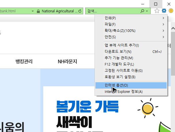 익스플로러는 브라우저를 실행했을 때 항상 농협은행 개인인터넷뱅킹바로가기를 할 수 있도록 설정하는 방법도 있기는 합니다만, 항상 이 사이트만 띄우는 것은 오히려 효율이 좋지 않아서 그리 권장하고 싶은 설정법은 아닙니다.