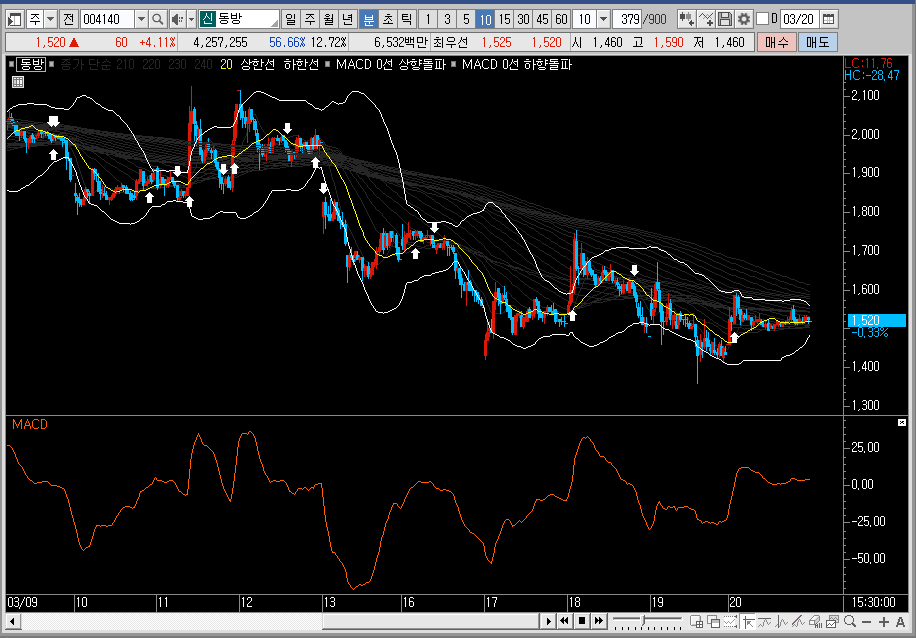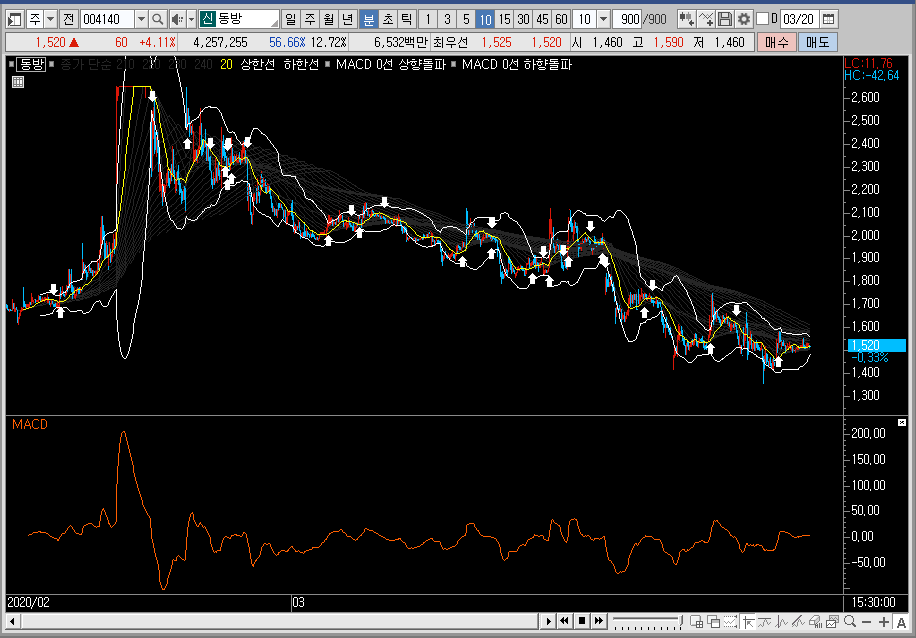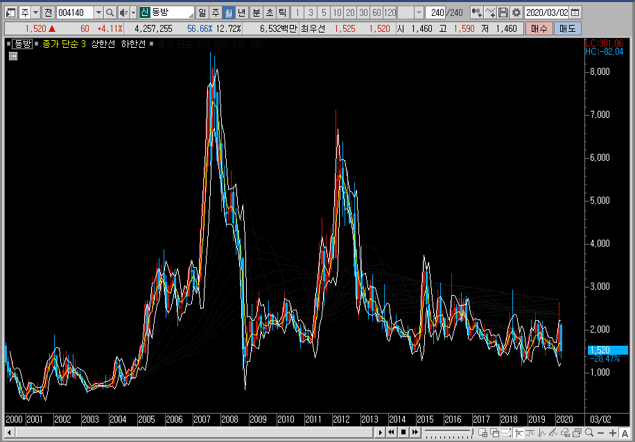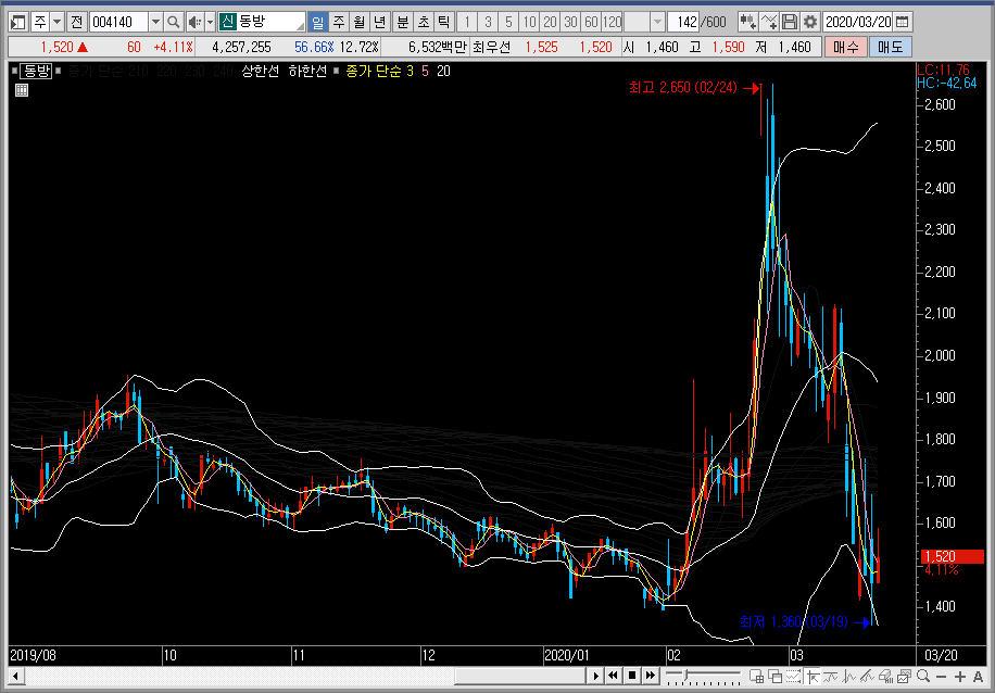보통 이런 형태로 밴드가 확장되고 커다란 변동성을 주는 그림은 선물에서 자주 보이는데, 이런 그림이 동방의 주가에도 나오는 것을 보면 확실히 요즘 시장상황이 여러모로 참 안타까운 상황인 듯합니다.