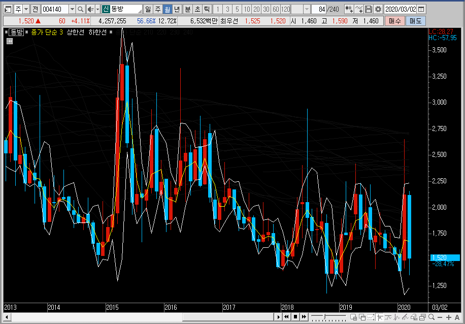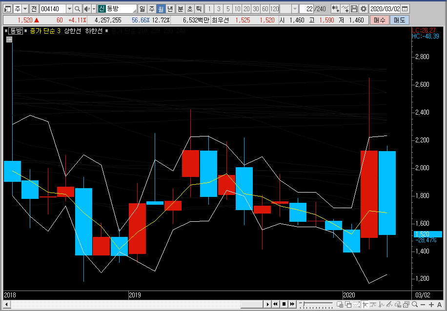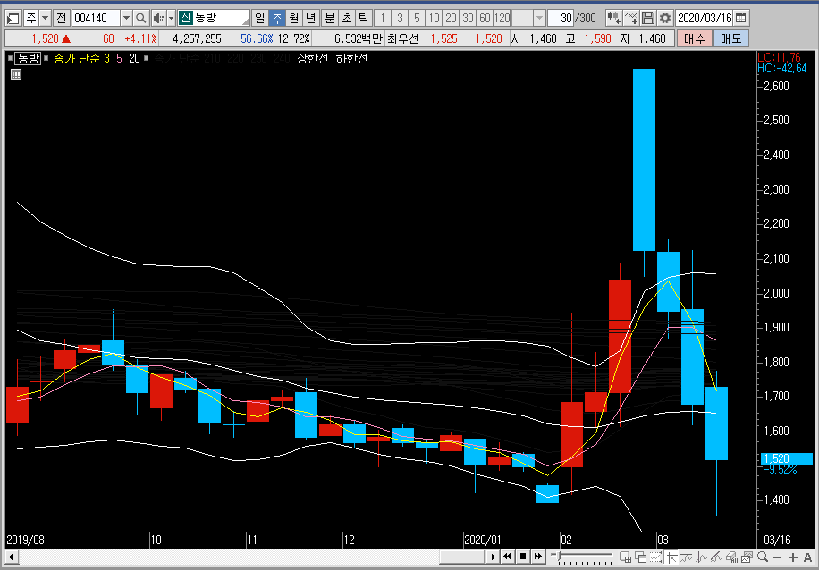 좌우간, 주봉으로 넘어가서 보면 음봉이 연속 네 개나 나오고 있는데, 다음주에는 중심선이나 꺾인 단기선의 저항을 테스트하기 위한 작은 양봉이 나올 가능성은 있지만, 그래도 동방의 주가가 반등할 것이라는 기대를 하기엔 다소 무리가 있을 듯합니다.