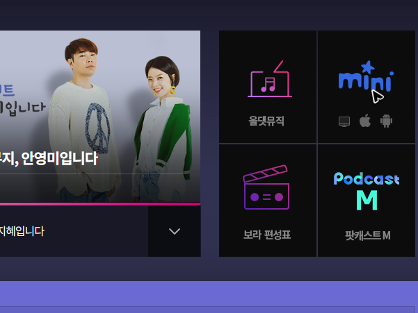 카테고리 메뉴를 누르고 세부 페이지로 이동을 했다면, 이번에는 두 개의 채널이 보일 거예요. 여기에서 들어보고 싶은 mbc의 라디오 채널을 선택하면 됩니다. 아니면 페이지 오른쪽에 보이는 미니를 눌러도 괜찮아요.
