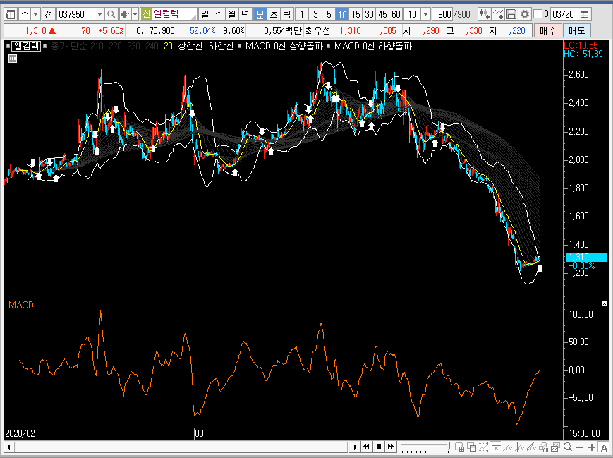 만약 주봉에서 엘컴텍의 주가가 밴드 하단의 지지력을 테스트하는 그림이 나온다면, 분봉에서 그 그림을 포착할 수 있을 것입니다. 시기는 월말이나 다음 달에 시가가 정해지고 아랫꼬리가 살짝 만들어지는 월초 정도가 적당하겠죠.