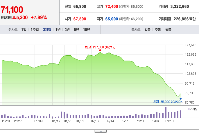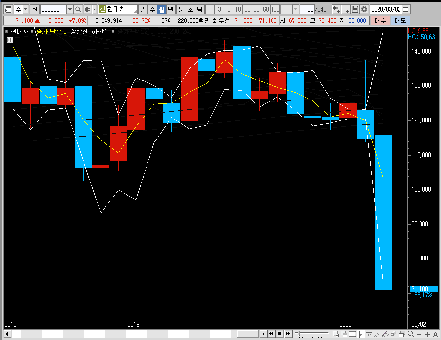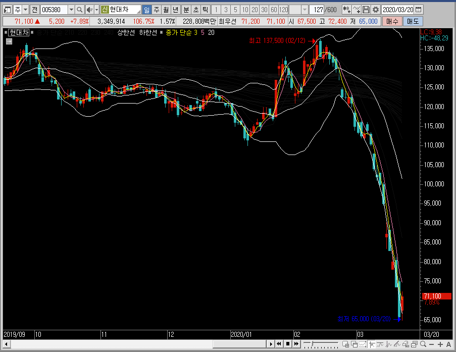 그래서 시장의 상황이 돌아오면 현대차의 주가도 회복할 것이라 예측하고 있습니다. 하지만 그렇다고 해서 이렇게 가파르고 강하게 빠지는 종목을 바로 공략하기엔 무리가 있을 듯합니다.