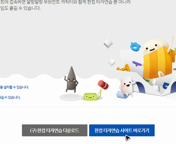 한컴의 페이지로 이동한 뒤에 아래쪽에 있는 회색 버튼을 누르면, 타자 연습을 무료설치하는 파일을 받을 수 있습니다. 그리고 여기에서도 온라인으로 바로 타이핑을 연습할 수 있는 웹 도구가 있는데, 혹시 사용해보고 싶다면 파란색을 눌러주세요.