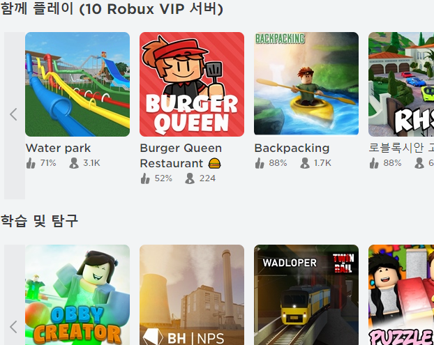 또 다른 게임을 다운받기하는 과정은 지금까지 roblox를 다운로드한 것과 과정이 완전히 동일합니다. 그냥 선택한 게임의 상세 페이지에서 초록색으로 된 재생 버튼을 누르기만 하면 온라인으로 게임을 하실 수 있을 거예요!
