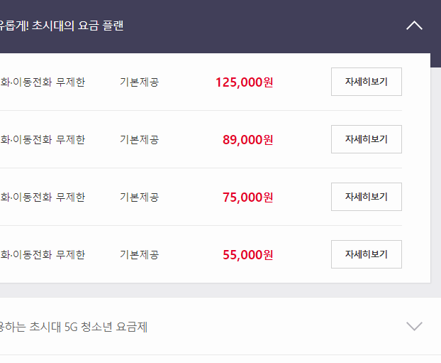 그룹을 선택하면 해당하는 skt의 요금제가 나열될 거예요. 그럼 데이터 사용량이나 기타 혜택들을 간략하게 살펴보고, 마음에 드는 항목이 있다면 자세히 보기 버튼을 누르면 됩니다.