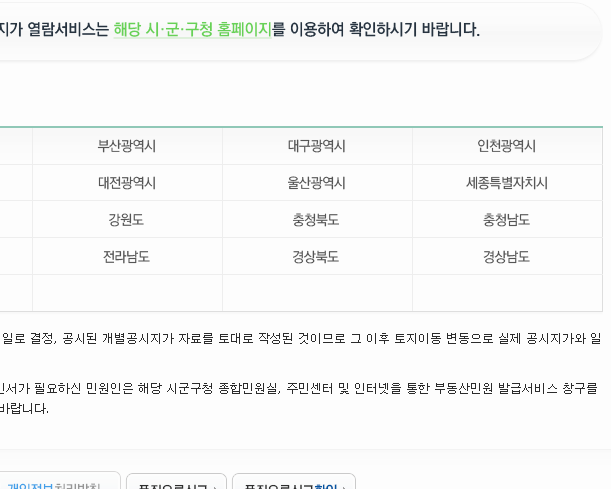 메인 화면에 있는 메뉴를 누르고 상세 페이지로 이동을 했다면, 여러 지역들이 표 안에 정리되어 있을 것입니다. 그럼 공시지가 조회하는 사이트에서 확인해보고 싶은 지역을 클릭하면 됩니다.