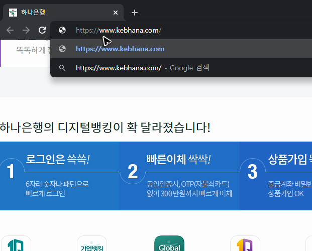 딱히 숨겨진 상태로 관리되는 은행 사이트가 아니기 때문에 검색하면 빠르게 송금이나 계좌 관리를 하는 홈페이지로 찾아갈 수 있지만, 그냥 주소창에 [kebhana.com]를 입력해서 keb하나은행에서 인터넷의 뱅킹으로 바로가기를 하는 것이 더 편해요.