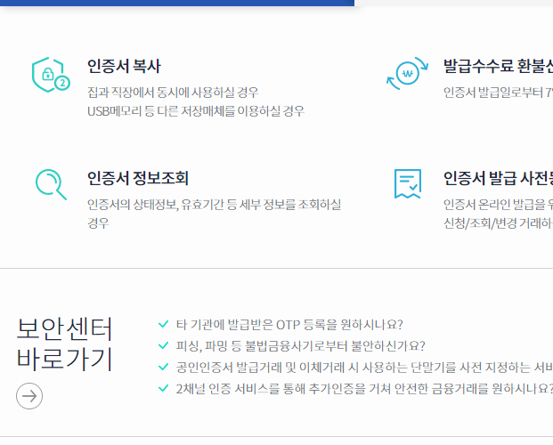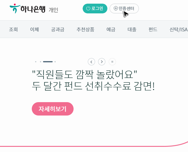 그리고 이렇게 keb하나은행 인터넷으로 뱅킹하는 곳에서 온라인으로 송금하고 통장 내역을 조회하려면, 본인 확인을 위한 공인인증서가 반드시 필요합니다. 혹시 인증서가 없다면, 인증센터라 적힌 버튼을 눌러야 해요.