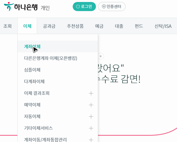 모듈을 준비한 뒤에는 다시 keb하나은행 인터넷으로 뱅킹하는 곳에서 필요한 메뉴를 누르고 로그인을 해주시면 됩니다. 아마 계좌에서 계좌로 이체하는 작업을 위해 찾아오시는 경우가 가장 많겠죠?
