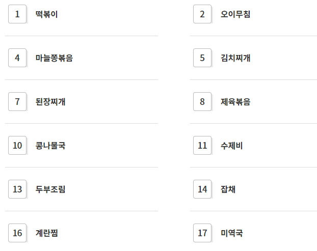 사이트를 보셔서 아시겠지만 간단한 아침식사로 적당한 요리만 있는 것이 아니라 점심과 저녁을 책임질 수 있는 정말 많은 요리들이 준비되어 있어요.