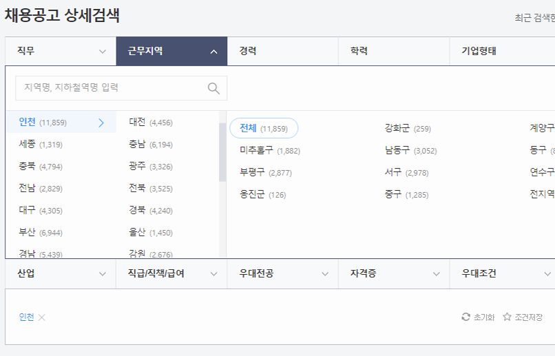 위에 적어둔 주소는 인천의 구인구직만 보여주는 전용 사이트가 아니라 통합 페이지로 연결되는 주소입니다. 그래서 메뉴를 눌러주셔야 해요. 우선 왼쪽 상단의 채용정보라 적힌 카테고리에 커서를 올려주세요. 그럼 몇 가지 메뉴들이 튀어나오는데, 지역별 그룹에서 위치를 선택하시면 됩니다.