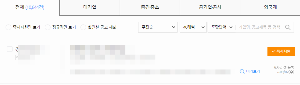 카테고리 메뉴를 누르면 전용 페이지로 이동하는 동시에 상세 검색을 위한 도구가 보일 거예요. 따로 상세 검색을 하지 않고 잡코리아에 올라온 모든 일자리를 둘러볼 수도 있겠지만, 시간을 아끼려면 아무래도 상세 검색을 통해서 일자리를 선별해보는 것이 좋을 것 같아요.