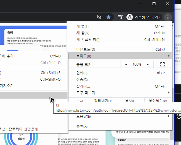 목록을 불러오는 방법은 브라우저 종류에 따라 다르기 때문에 세세하게 설명하는 것이 어려워요. 하지만 대부분의 브라우저는 우측 상단의 설정 메뉴를 클릭하거나, 별표 모양의 아이콘을 다시 한 번 클릭하면 목록을 불러올 수 있습니다. 저처럼 크롬을 쓰고 있으시다면 [Ctrl + Shift + B]를 눌러서 목록을 불러오는 것도 가능해요.
