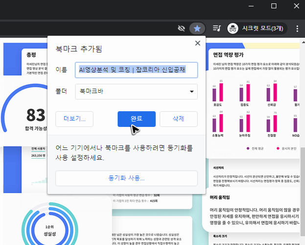 북마크에 추가하는 방법은 이미 알고 계시겠지만, 얘기하지 않으면 제가 아쉬워서 조금만 설명을 해볼게요. 그냥 브라우저에 잡코리아를 띄우고 주소창 우측에 있는 별표 모양의 아이콘을 누르면 됩니다.