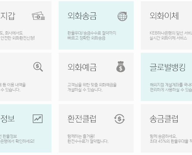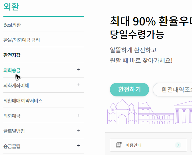 현재의 달러 시세를 확인한 뒤에는 필요에 따라 왼쪽 카테고리 메뉴를 추가적으로 활용하시면 될 것 같아요. 아무래도 금융 페이지라 그런지 외환은행의 환율조회하는 것 외에도 다양한 서비스를 제공하고 있습니다.