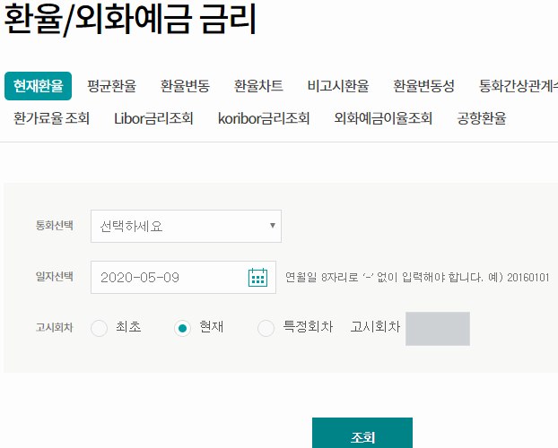 카테고리 메뉴를 누르면 날짜를 선택하는 화면이 나오는데, 보통은 오늘의 실시간 가격을 알아보실 테니, 이 부분을 무시하고 아래쪽에 나오는 외환은행의 환율조회 화면을 살펴보시면 됩니다.