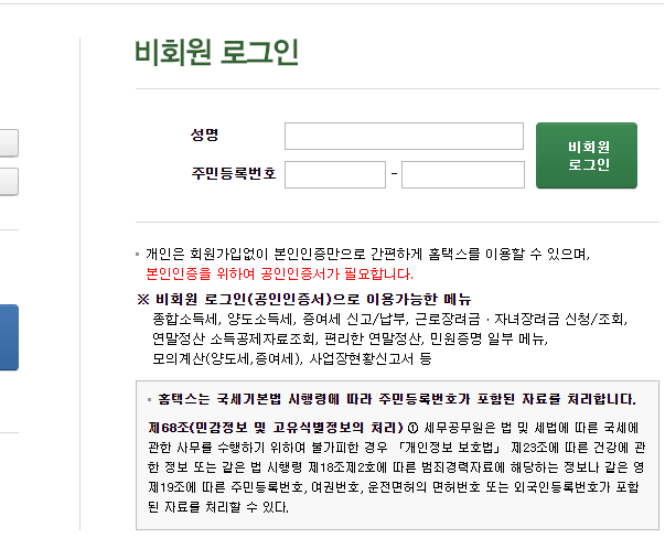 페이지에 있는 메뉴를 클릭하면 로그인을 하는 화면으로 넘어갈 거예요. 그런데 현금영수증 사용내역의 조회를 할 때 꼭 등록하고 로그인을 해야 하는 것은 아닙니다. 비등록방식으로 진행해도 원하는 정보를 얼마든지 체크할 수 있어요.