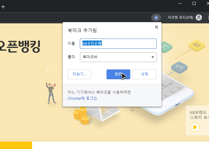 북마크로 구성하고 싶을 땐 주소창 오른쪽에 보이는 별표를 클릭하고, 이름을 적당히 지정한 뒤에 확인 버튼을 클릭하면 됩니다. 그럼 크롬에서 국민은행 개인인터넷뱅킹의 바로가기를 하는 북마크가 추가될 거예요.