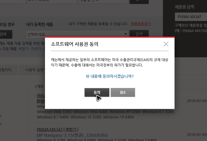 기왕이면 버튼을 눌렀을 때 바로 파일이 받아지면 좋을 텐데, 사용권 문구가 나옵니다. 만약 동의하지 않는다면 캐논 프린터 드라이버의 다운로드를 할 수 없으니, 사용권은 동의를 해주셔야만 해요.