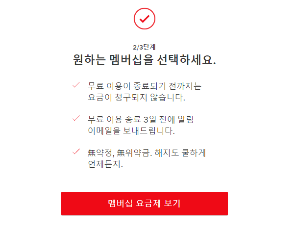공식 페이지를 방문한 뒤에는 중간에 있는 빨간색 버튼을 클릭해주세요. 버튼을 클릭해도 넷플릭스의 요금이 바로 빠져나가는 것은 아니기 때문에 걱정하지 않으셔도 괜찮아요. 그냥 다음 페이지로 넘어갈 뿐이예요.