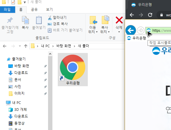 저는 크롬 브라우저를 쓰고 있어서 크롬을 기준으로 한 우리은행 인터넷뱅킹의 홈페이지를 만드는 과정을 얘기했는데, 사실 익스플로러도 과정은 완전히 동일해요. 주소창 왼쪽에 있는 파비콘을 드래그하면 버튼이 됩니다.