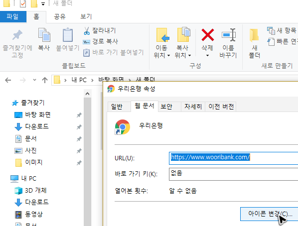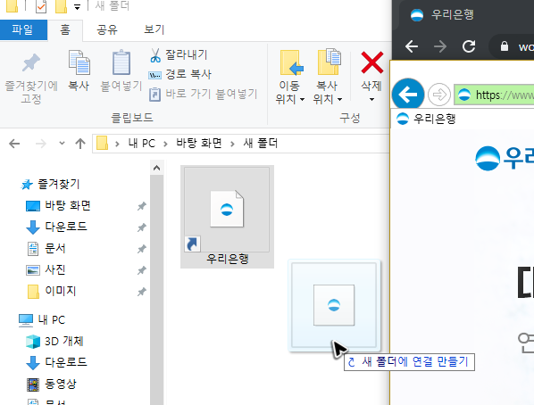 어떤 방법이 됐든, 사이트를 찾은 뒤에는 버튼을 보관할 폴더를 하나 만들어주세요. 그냥 바탕화면에 우리은행의 인터넷뱅킹 홈페이지를 놔둘 예정이라면 폴더를 따로 생성하지 않아도 괜찮습니다.
