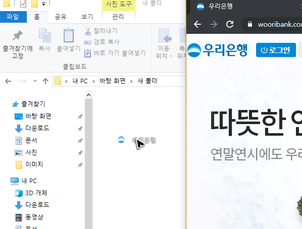 폴더를 준비한 뒤에는 준비해둔 브라우저로 돌아와주세요. 그리고 주소창 왼쪽 부분에 마우스 커서를 올려주세요. 이제 폴더로 드래그 앤드 드롭을 해주면 우리은행 인터넷뱅킹의 홈페이지 버튼이 하나 만들어지게 됩니다. 쉽죠?