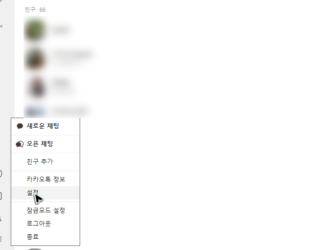 설정 버튼을 클릭하면 다른 화면이 하나 띄워지는데, 여기에서 pc 카카오톡을 설치할 때 수정할 수 없었던 여러 종류의 설정옵션을 기호에 맞게 수정해줄 수 있습니다. 어려운 항목은 없으며, 하나씩 살펴보고 수정을 해주시면 될 것 같아요.