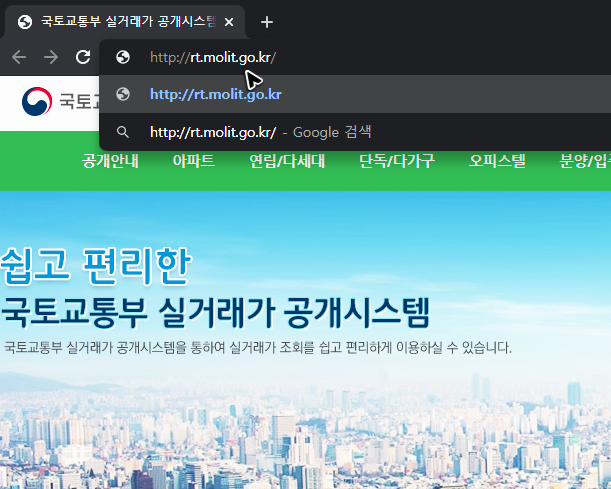 국토교통부에서 제공하는 실거래가나 기타 데이터는 딱히 숨겨진 상태가 아닙니다. 그래서 검색하면 빠르게 알아보기를 할 수 있겠지만, 더 편하게 공시지가 조회하는 사이트와 알리미를 찾으려면, 주소창에 [realtyprice.kr]를 입력하는 것이 좋아요.