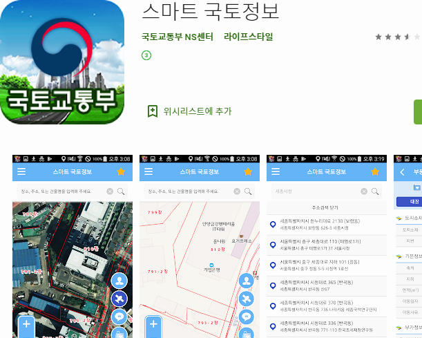 플레이스토어에서 검색해보면 의 데이터와 관련된 여러 종류의 어플이 나오는데, 제공해주는 공시지가의 정보는 비등비등한 수준이니, 적당히 하나를 골라서 설치하면 됩니다.