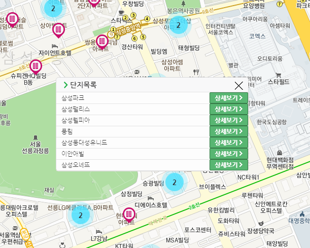 위치를 지정한 뒤에는 오른쪽 지도에서 오른쪽에서 지도 위치가 로딩되고, 몇 가지 숫자들이 보일 거예요. 이 숫자를 클릭하고 항목을 한 번 더 누르면 부동산 실거래가와 관련된 정보들을 확인할 수 있을 것입니다. 전국 어디나 확인할 수 있어요.