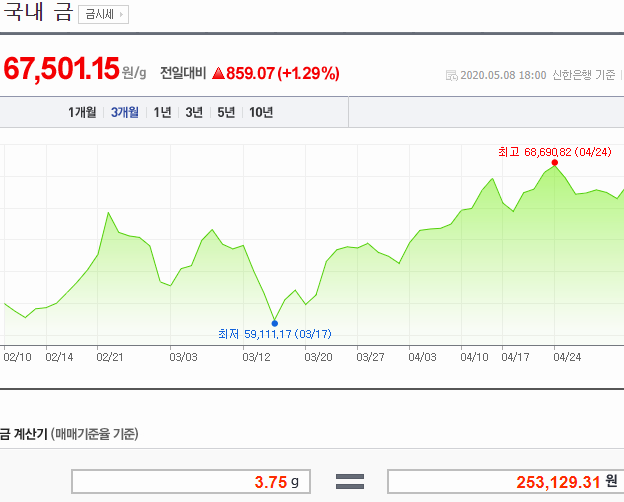 그리고 국제의 금시세가 아닌 국내를 나타내는 차트를 클릭하면 마찬가지로 상세한 정보가 있는 차트를 볼 수 있고, 동시에 단위 계산을 할 수 있는 계산기도 볼 수 있습니다.
